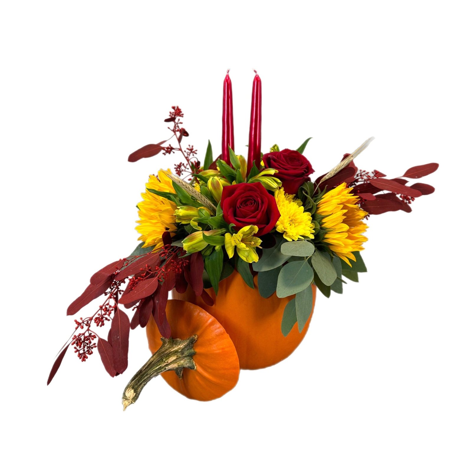 This stunning Thanksgiving Candle center peace is perfect for fall celebrations. Featuring seasonal blooms in orange, yellow and red it is sure to impress!