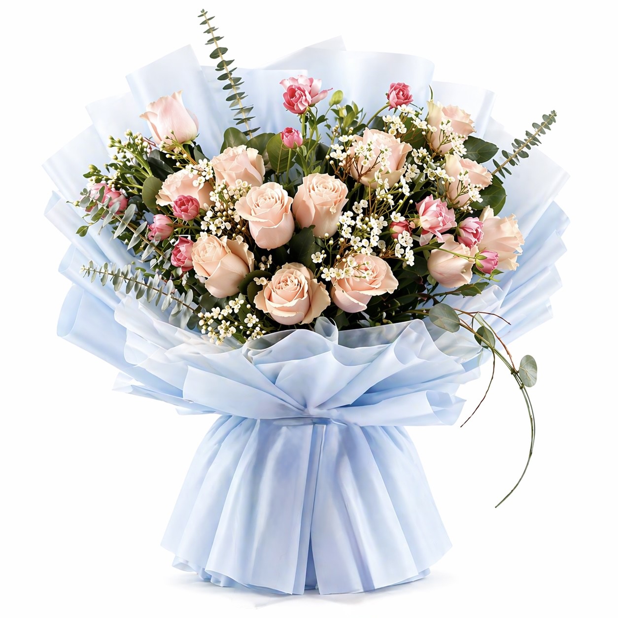 Embrace untamed beauty with our Boho Style Dozen Roses – a dreamy dozen blush-pink roses nestled among clouds of baby’s breath, delicate waxflower, and silver-dollar eucalyptus. Wrapped in layers of airy sky-blue mesh and tied with a flowing ivory satin ribbon, this hand-tied bouquet drifts like a summer breeze.