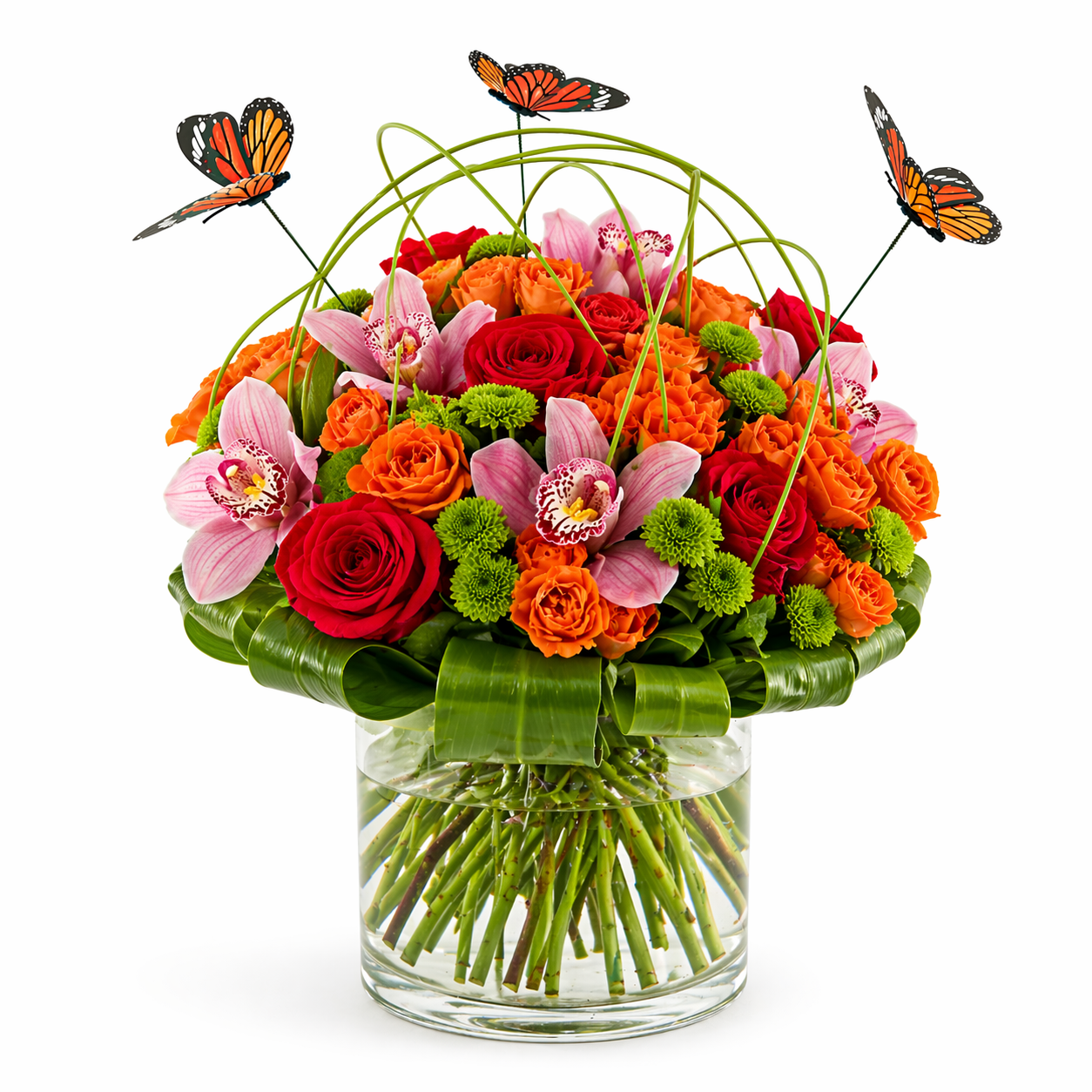 Brighten any occasion with our Butterfly Bliss Arrangement – a delightful mix of vibrant orange roses, deep red roses, lush green hydrangeas, and exotic orchids, accented with playful butterfly accents and elegant curly stems. Presented in a sleek glass vase with rich foliage, this arrangement combines whimsical beauty with sophisticated flair.