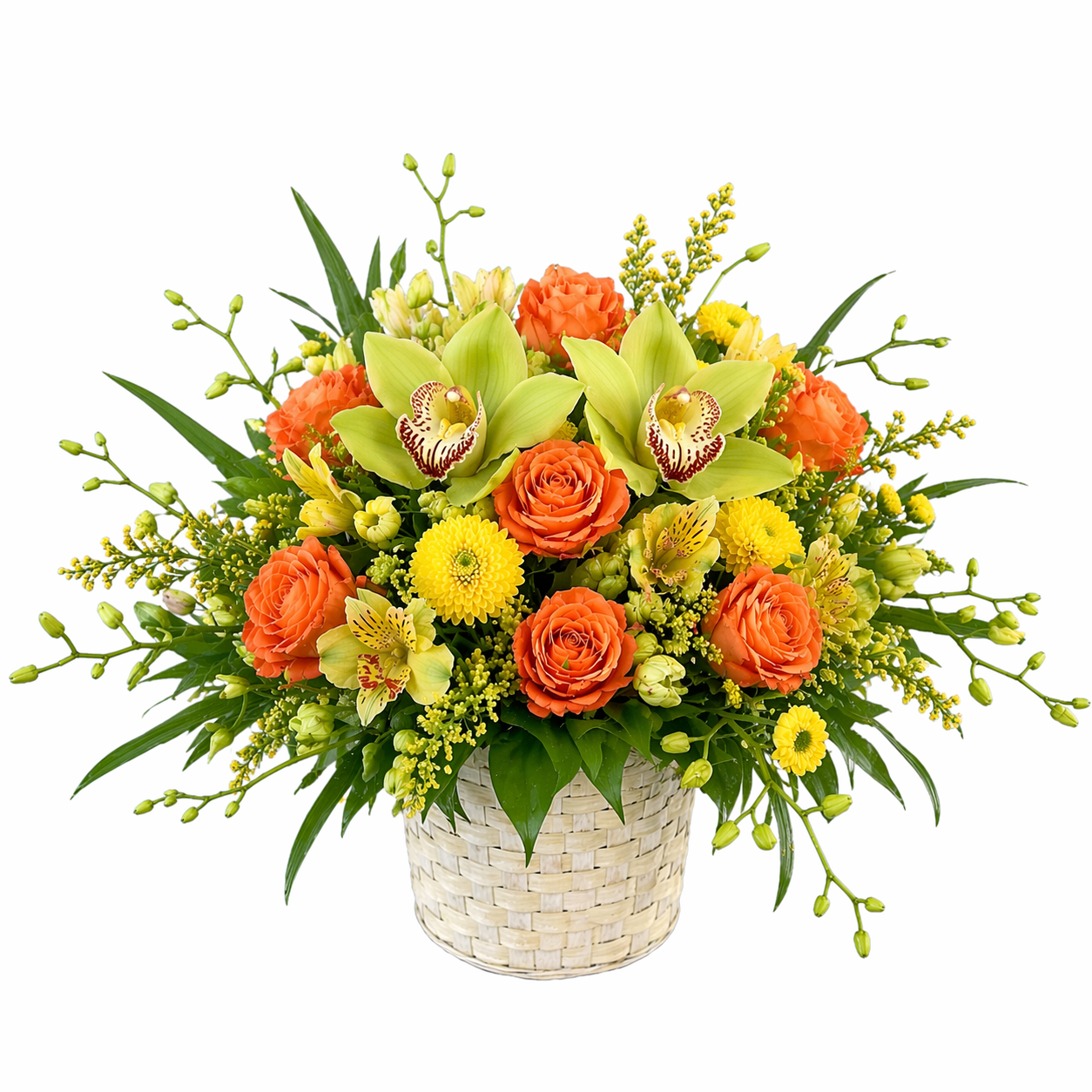 Premium orange roses, yellow chrysanthemums, green orchids, and assorted greenery