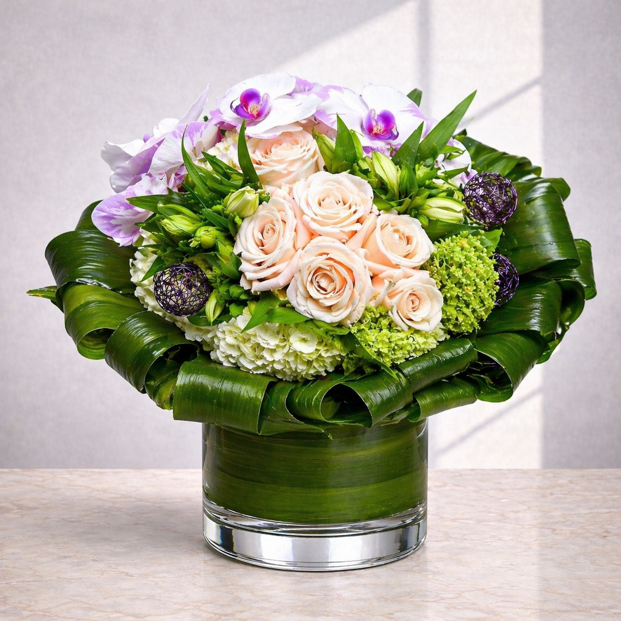 Enchant with the Circle of Purple Arrangement – a beautiful blend of premium pink roses, purple orchids, white hydrangeas, and lush green foliage, expertly hand-arranged in a circular design. This graceful display exudes charm and sophistication, perfect for anniversaries, thank you gestures, or adding a touch of elegance to special occasions.