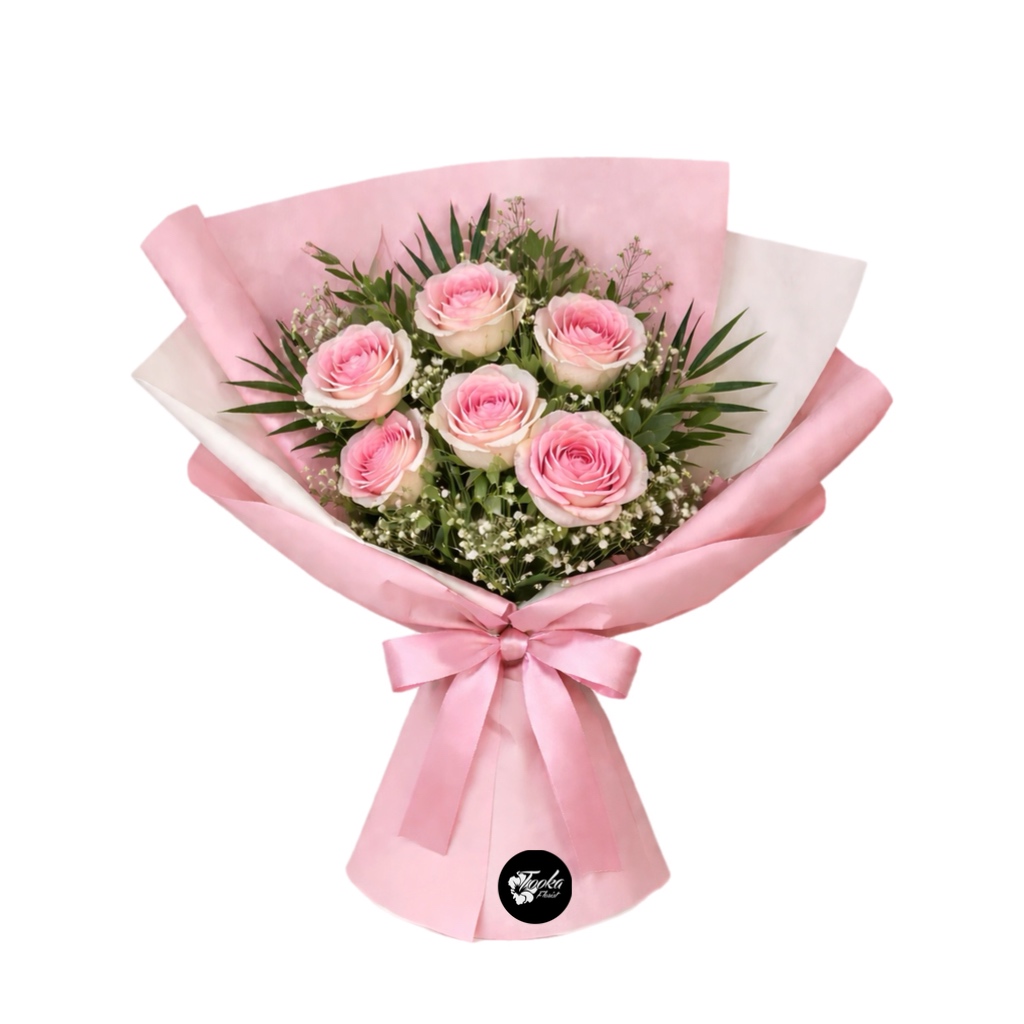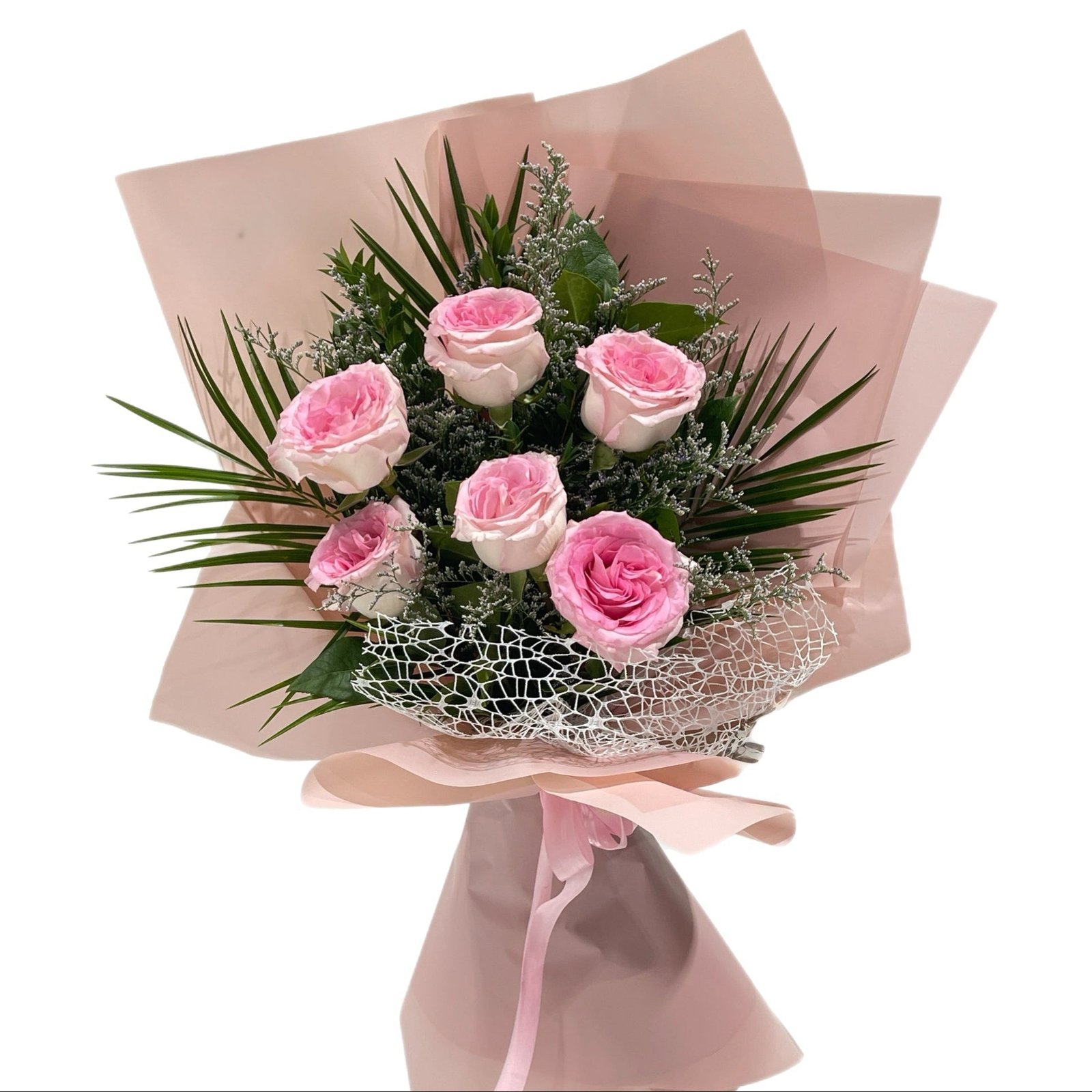 Timeless and elegant, our Classic Half-Dozen Pink Roses bouquet features six fresh soft pink roses, beautifully arranged with fresh greenery and delicate filler accents. Wrapped in blush-toned paper and finished with a soft ribbon, this bouquet is perfect for expressing love, admiration, and appreciation.