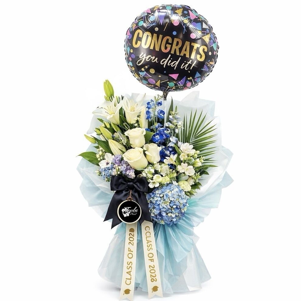 Celebrate their victory with our Congratulations Bundle—a sky-blue wrapped bouquet of ivory roses, sapphire delphinium, snowy lilies, and lush blue hydrangea, accented by tropical palm and crisp greenery. Elevated by a festive “CONGRATS you did it!” balloon and tied with a sleek black ribbon and custom “Class of 2023” sash, this hand-tied triumph radiates achievement.