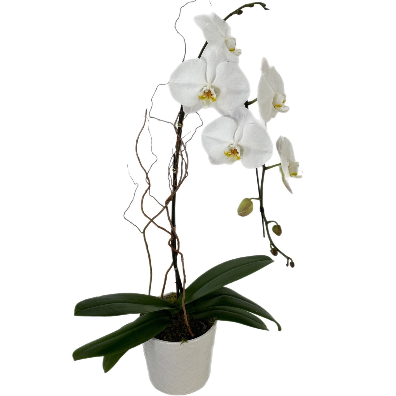 Elevate serenity with our Delicate Duo Orchid – a refined potted plant featuring two elegant white phalaenopsis stems with silky blooms and subtle buds, accented by twisted curly willow vines. Nestled in a textured white ceramic pot, this living masterpiece embodies quiet luxury and enduring grace.