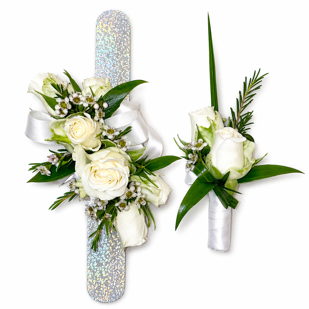 Turn heads and elevate your formal look with our Elegant White Rose Prom Set – a stunning pairing of a wrist corsage and boutonniere crafted with premium white roses, delicate wax flowers, and lush greenery. This timeless set is designed with silver ribbon accents and presented on a shimmering iridescent wristband, creating a soft, sophisticated aesthetic perfect for proms, formals, and weddings.