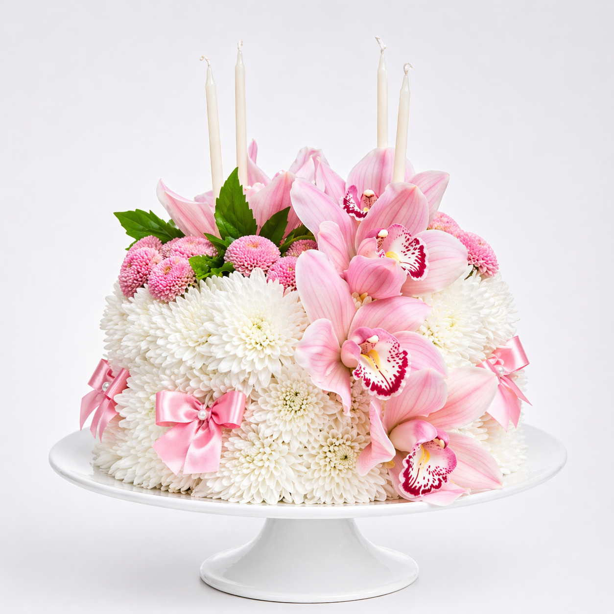 Our vibrant flower cake has all the ingredients for a happy celebration. This confection-inspired creation is the perfect centerpiece for any birthday party. This stunning cake-shaped floral arrangement with pink and white carnations, pink cymbidium orchid and candles is sure to delight. This arrangement arrives on a raised white plate and wrapped in clear cellophane tied with a satin ribbon. Our florists hand-design each arrangement, so colors and varieties may vary due to local availability. Low carb and Gluten-free.