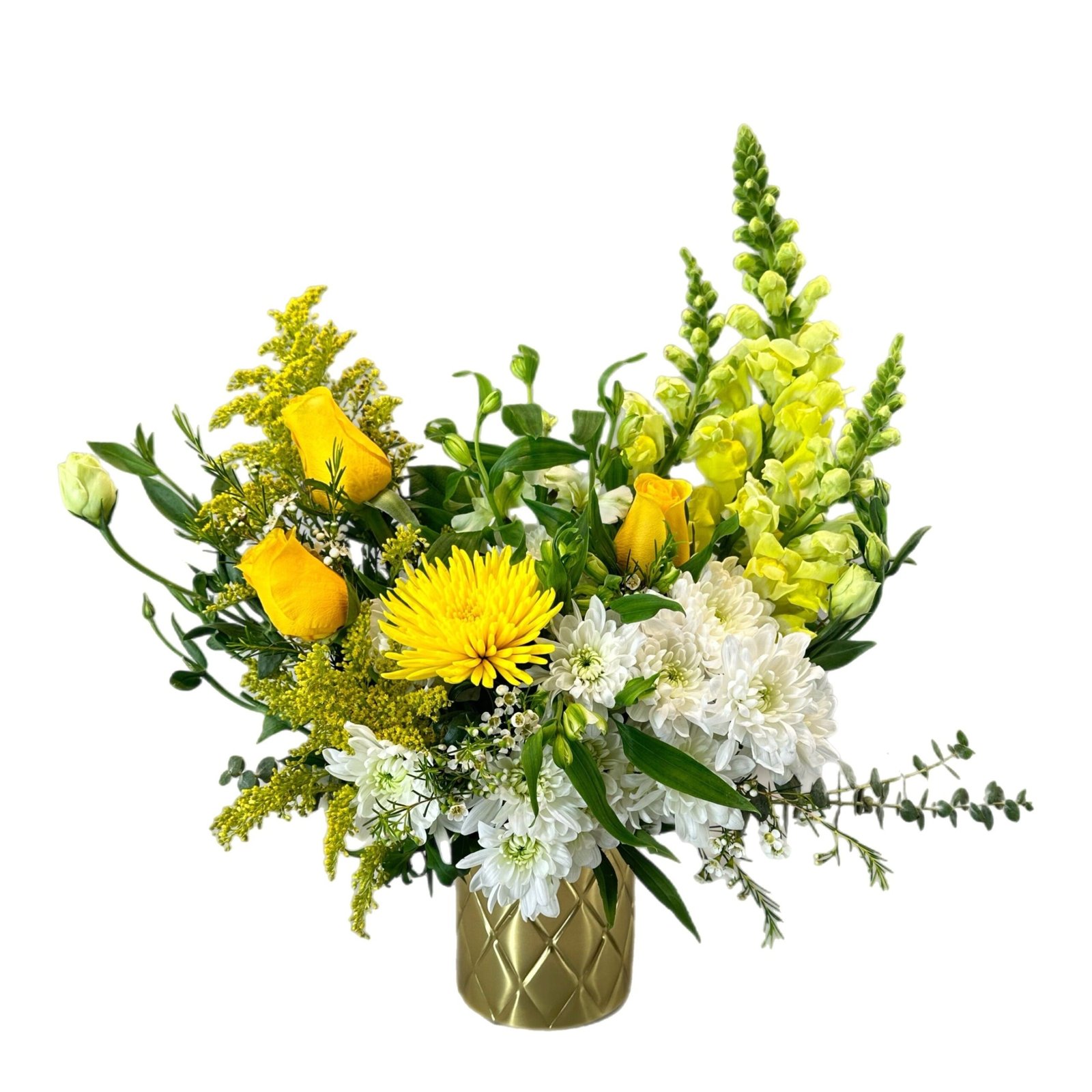 Brighten someone’s day with the cheerful beauty of our Golden Glow arrangement. Bursting with vibrant yellow roses, snapdragons, and chrysanthemums, this design is balanced with creamy white blooms and lush greenery for a look that’s both uplifting and refined. Presented in a quilted gold ceramic vase, it adds a touch of luxury to any occasion.