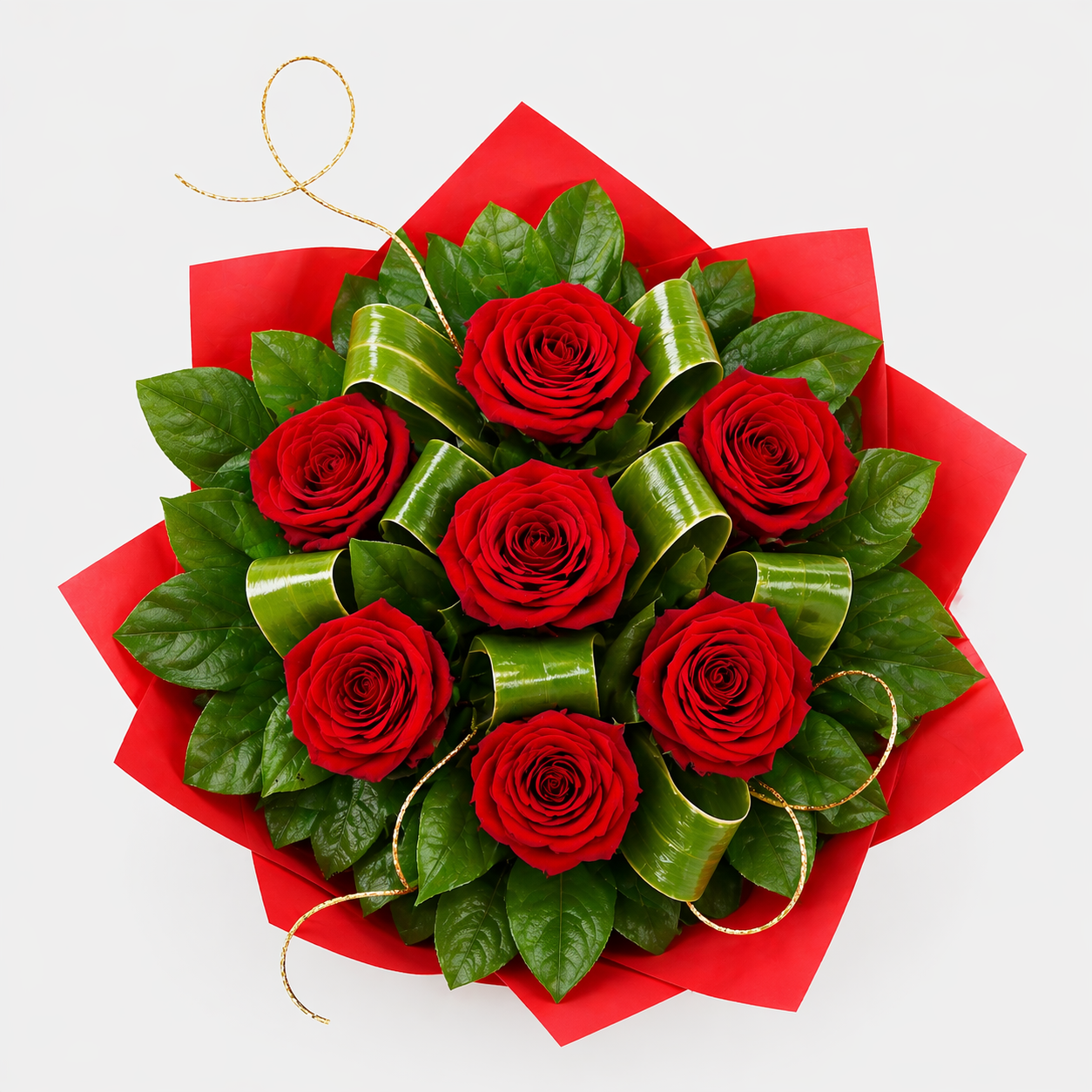 Ignite the spark with our Half Dozen Red bouquet – six velvety crimson roses nestled in glossy aspidistra loops and framed by dramatic palm fronds, with golden wire accents for a touch of shimmer. Wrapped in vibrant scarlet tissue and tied with a sleek ribbon, this hand-tied gem packs timeless devotion into every petal.
