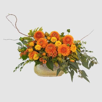 Exude warmth and rustic charm with the Maple Kiss Hand Tied Bouquet – a stunning arrangement featuring premium fresh flowers, including red roses, peach dahlias, orange alstroemerias, and lush green eucalyptus, all beautifully hand-tied for a natural look. This rich display radiates autumnal beauty and elegance, perfect for anniversaries, thank you gestures, or adding a cozy touch to any space.