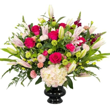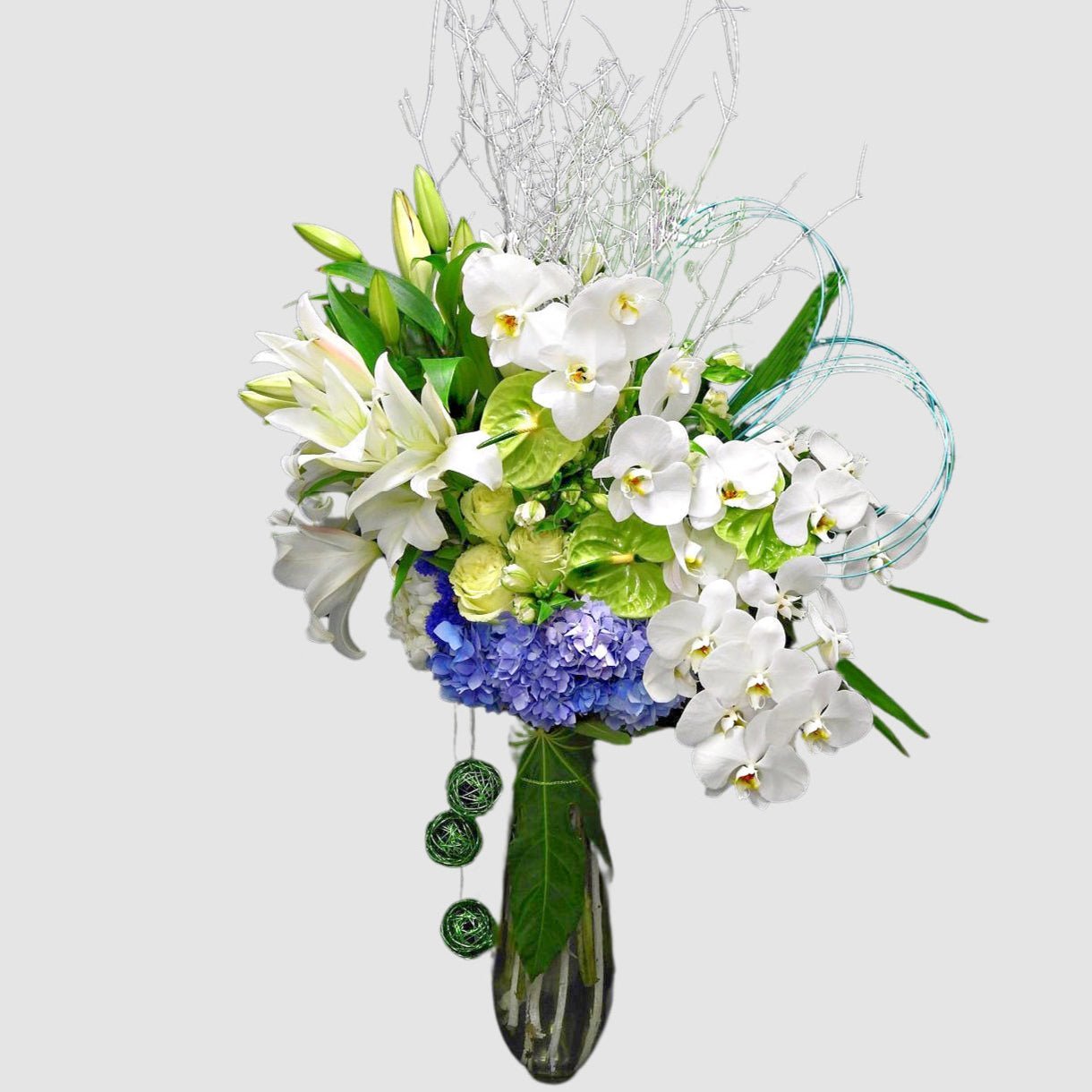 The “Most Impressive” is a grand and stunning floral arrangement, perfect for gifts, home décor, or special occasions. This awe-inspiring centerpiece features a lavish mix of white lilies, green orchids, and vibrant blue hydrangeas, accented with lush green leaves and delicate silver wire accents, all elegantly arranged in a sleek dark vase. Ideal for weddings, celebrations, or making a bold statement in your space, this arrangement exudes extraordinary beauty. Search for “most impressive bouquet” or “luxury floral arrangement” to explore more!