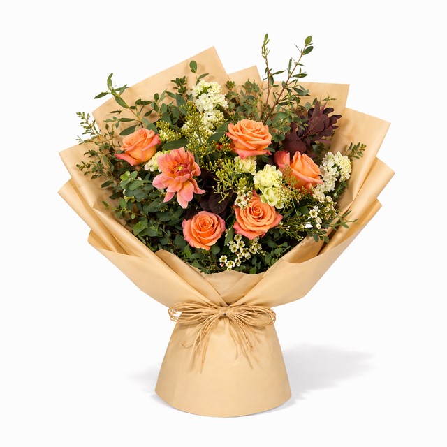 Capture the glow of twilight with our Orange Delight Hand Tied Bouquet—sunset-orange roses and peach dahlias nestled among ivory stock, wispy eucalyptus, and dark plum foliage. Wrapped in earthy kraft paper and tied with natural twine, this handcrafted bundle radiates warmth and effortless grace.