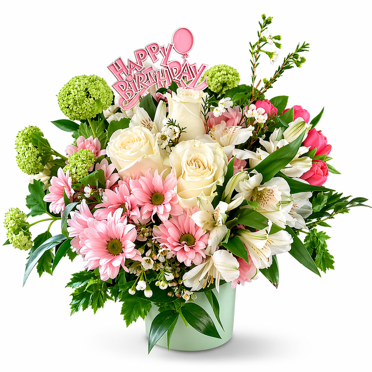 Shower the day in softness with our Pink Birthday arrangement – a tender cascade of ivory roses, blush chrysanthemums, pale pink tulips, and creamy alstroemeria, sprinkled with lime-green viburnum and wispy waxflower. A delicate “Happy Birthday” pick with a tiny balloon floats above, all nestled in a matte mint-green ceramic vase.