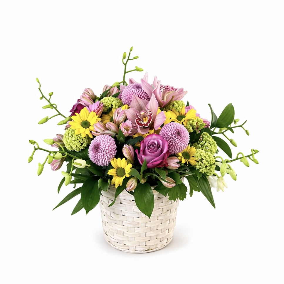 Delight the senses with our Pink Blooming Basket—a woven white wicker vessel brimming with lavender roses, exotic pink cymbidium orchids, sunny yellow daisies, and playful pom-pom chrysanthemums. Sprays of delicate white dendrobium orchids dance above lush green foliage, crafting a miniature meadow of joy.