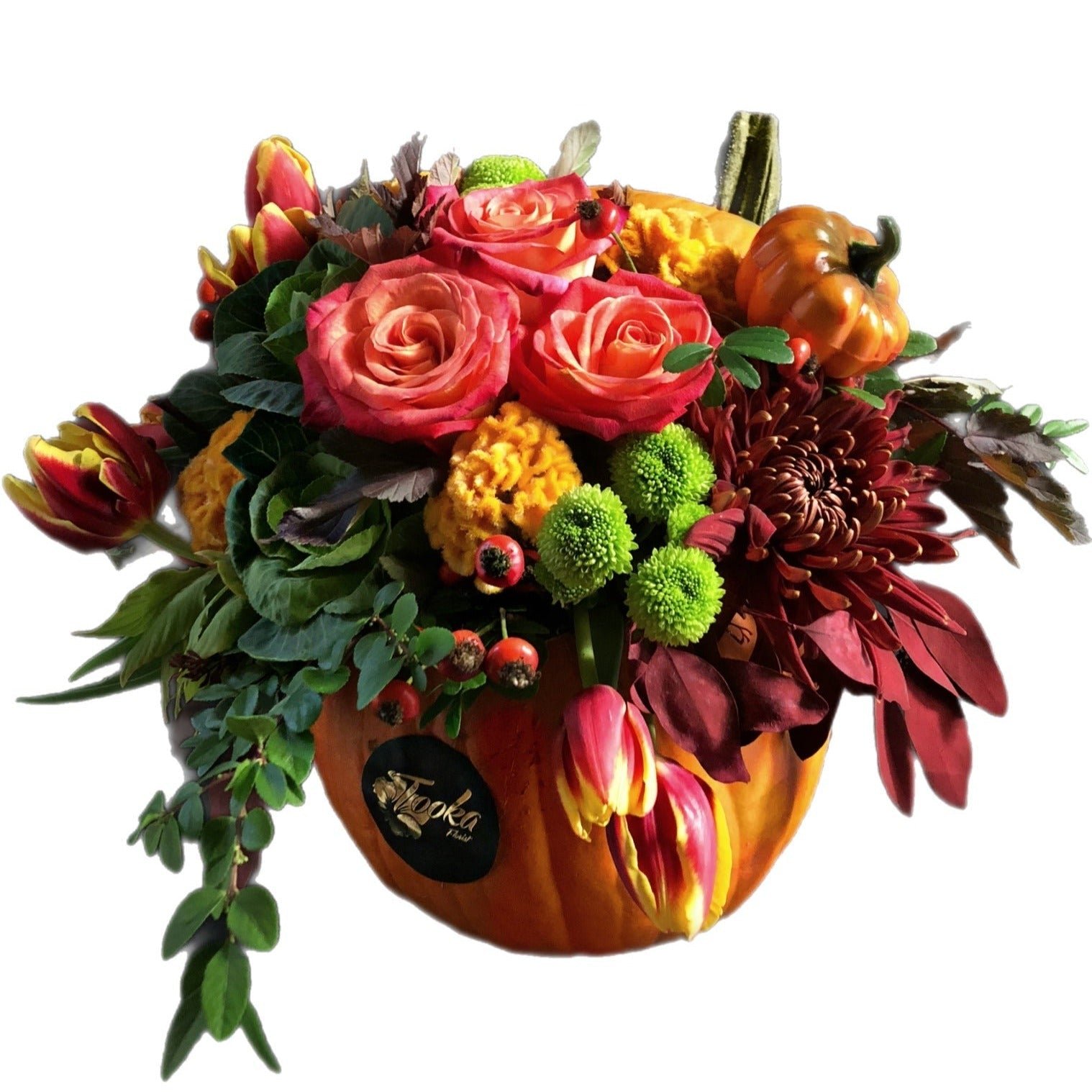 - A fall-inspired medley of premium blooms, including orange roses, burgundy chrysanthemums, tulips, and green pompons