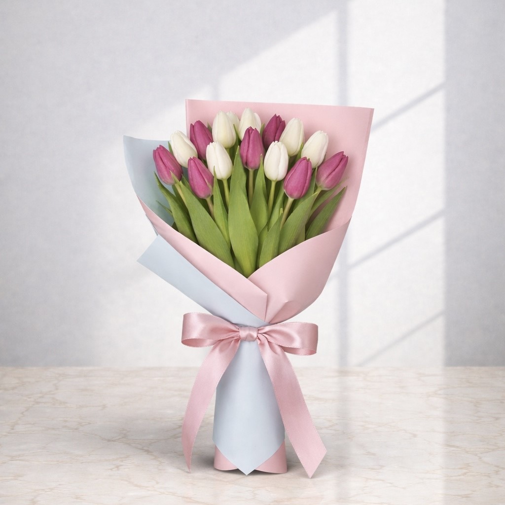 Fresh, bright, and full of seasonal charm, our Spring Vibe Tulips Bouquet features a beautiful 15 steams mix of pink and white tulips, wrapped in soft pastel tones for a clean, modern look. This bouquet captures the feeling of spring light, joyful .