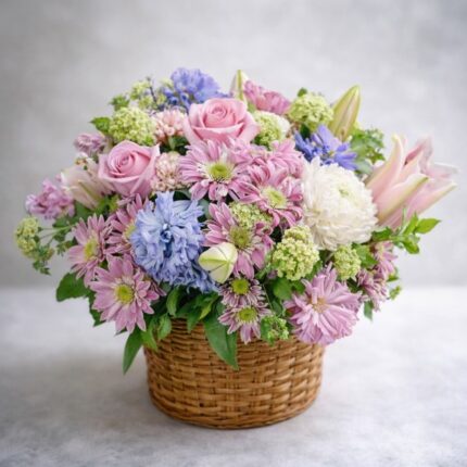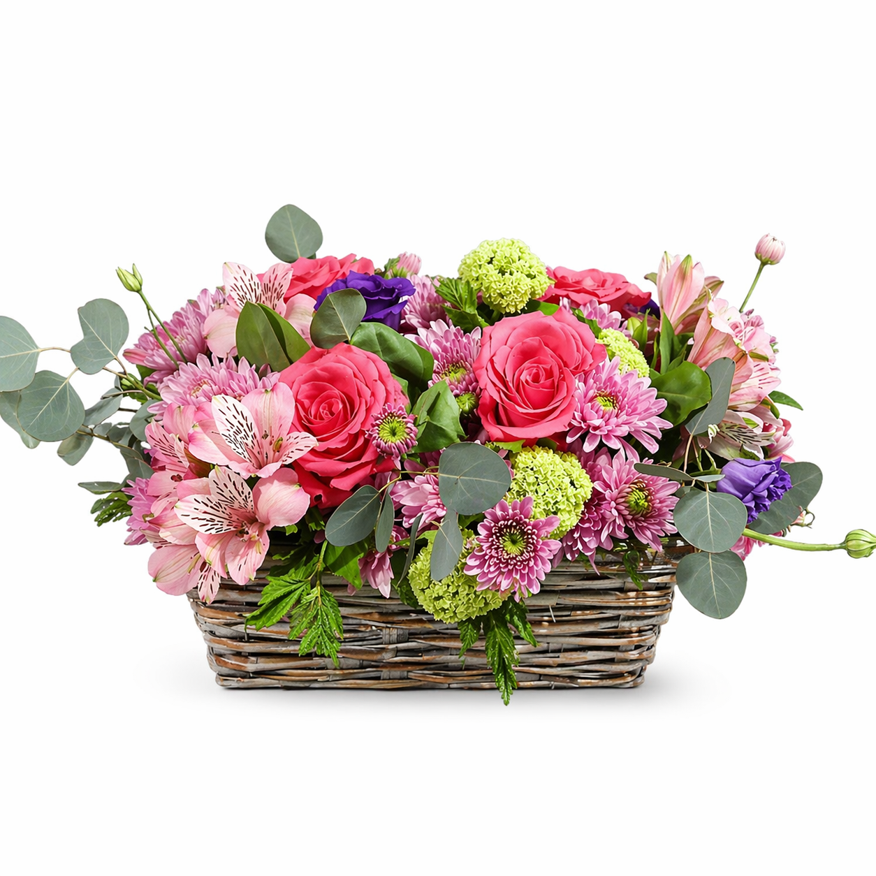 Savor the moment with our Strawberry Jam basket – a playful tumble of hot-pink roses, blush alstroemeria, lime-green chrysanthemums, and purple statice, woven with silver eucalyptus and pops of viburnum. Tucked into a rustic white-washed wicker basket, this vibrant medley is like a spoonful of summer jam in full bloom.